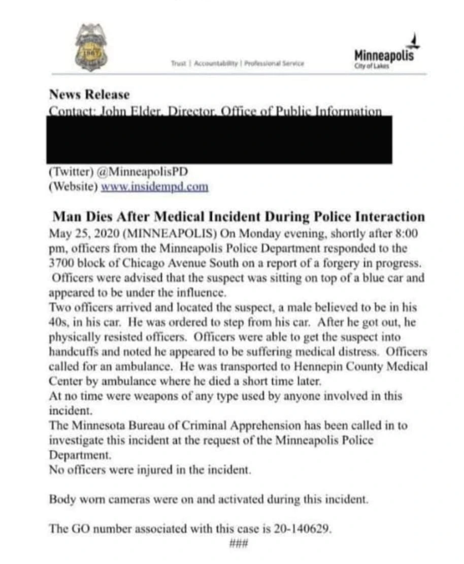 아래는 조지를 죽인 백인 경찰인 데릭 쇼빈이 당일 경찰에 제출한 보고를 바탕으로 미네아폴리스 경찰이 발표한 보도자료이다.