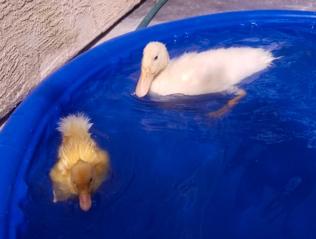 동그리는 오그리와는 달리 굉장히 활발하고 에너지가 넘치는 아이입니다. 뛰는 속도도 번개 같고요, 수영도 기가 막히게 잘합니다. 아직 일주일도 안 된 아기인데 활동성은 벌써 오그리를 훨씬 앞지릅니다. 오리 두 마리가 헤엄칠 수 있는 고무풀로 수영장을 만들어 주었는데, 동그리는 수영장에 혼자 들어가고 나올 수 있는데, 오그리는 혼자 들어갈 줄만 알고, 나오지는 못합니다. 누가 꺼내 줘야지 나올 수 있죠. 계단도 조금이라도 높으면 올라가지 못합니다. 동그리는 태어났을 때 엄마와 형제가 곁에 있었지만 오그리는 내내 혼자여서 그런 것 같다는 생각에 마음이 짠합니다.