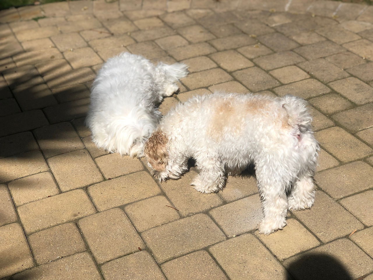 그러다가 우디를 데려왔다. 우디는 말티푸와 말티즈 사이에서 태어난 개이니까 75% 말티즈에 25% 푸들 정도 될 것 같다. 이제 다 자랐는데 전반적인 크기는 테디와 비슷하지만 몸이 훨씬 가늘고 가볍다. 처음 며칠은 우리 집이 낯선지 많이 울고 덩치 큰 테디가 다가가면 구석에 숨어서 나오지 않았다.