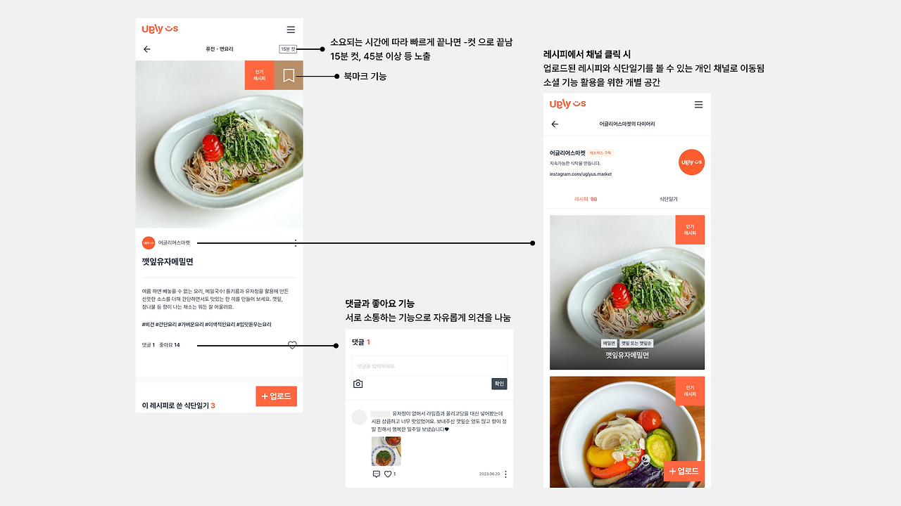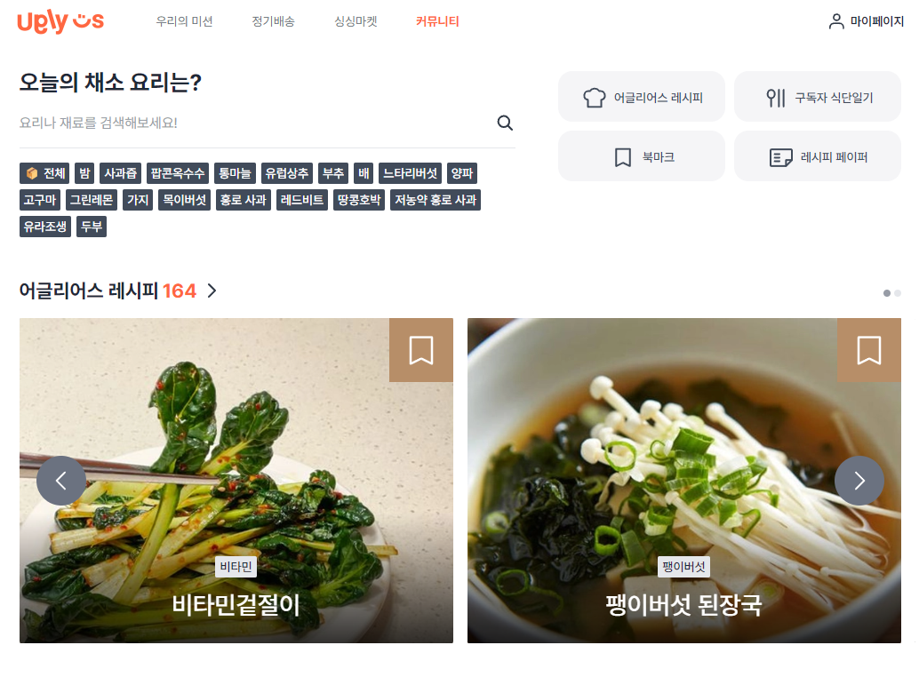 어글리어스 마켓에서는 레시피를 공유하는 커뮤니티가 따로 있다. 배송되는 채소 요리 레시피 외에 구독자들이 직접 만든 요리 레시피나 사진을 올리고 좋아요, 댓글을 남길 수 있다.