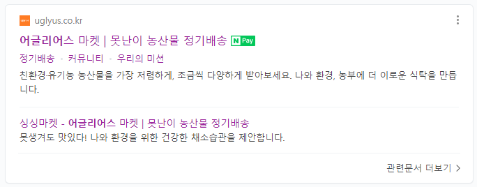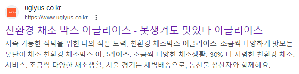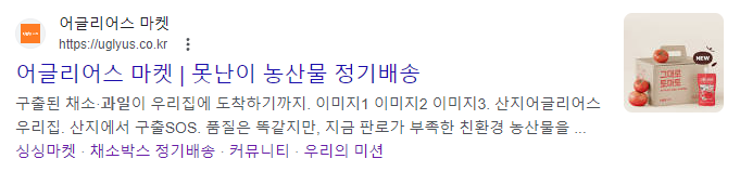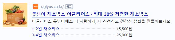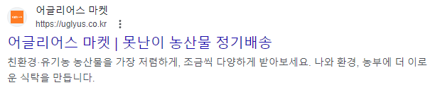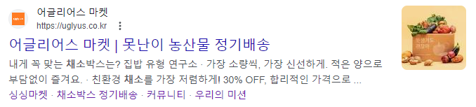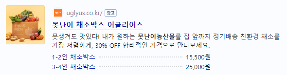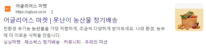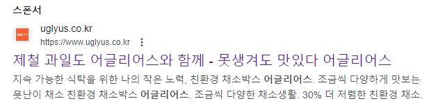 어글리어스 마켓이나 못난이농산물, 못난이채소 등 키워드를 검색했을 때 어글리어스 마켓이 상위에 노출되고 있다. 작성된 카피들을 보면 주요 키워드를 '못난이농산물', '못난이채소'로 일관되게 잡고 있다. 브랜드의 위치나 이미지를 굳건히 하려고 하는 것 같다. 카피는 키워드에 따라 조금씩 다른 것 같은데 내용은 비슷하다. (친환경, 유기농 농산물, 못난이농산물, 정기배송, 저렴하게, 가격) 소비자들이 자주 검색할 것 같은 키워드는 구글키워드 플래너 같은 사이트를 참고해서 잘 잡고 만들면 좋을 것 같다.