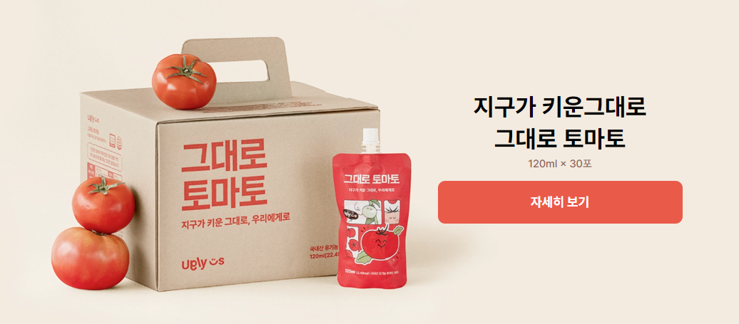 어글리어스 마켓은 농가에서 직접 가져온 제품을 판매하는 것을 넘어, 실제 제품을 만들어 판매하기도 한다. 최근에는 '그대로 토마토'라는 이름으로 토마토 주스를 만들어 홈페이지와 앱에서 판매 중이다. 못난이 토마토나 일반 토마토로 만든 주스는 겉모습만 다르지 맛에선 차이가 없다는 걸 쉽게 보여주는 것 같았다.