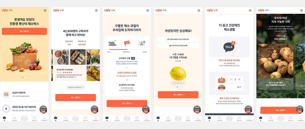 어글리어스 마켓의 브랜딩에 있어서 못난이농산물 구독, 구매와 같은 직접적인 말로 언급하지 않고 '구출'이라는 단어를 사용한 접근이 인상적이다. 그리고 커뮤니티 공간도 정말 좋은 것 같다. 채소박스 구독자들이 후기를 올릴 때 주로 요리한 음식의 사진을 공유하는데, 직접 레시피를 공유할 수 있는 공간을 제공하고 사용자 간 소통할 수 있도록 소셜 기능을 제공해 어글리어스 마켓에서 좋은 경험을 만들어주는 것 같다.