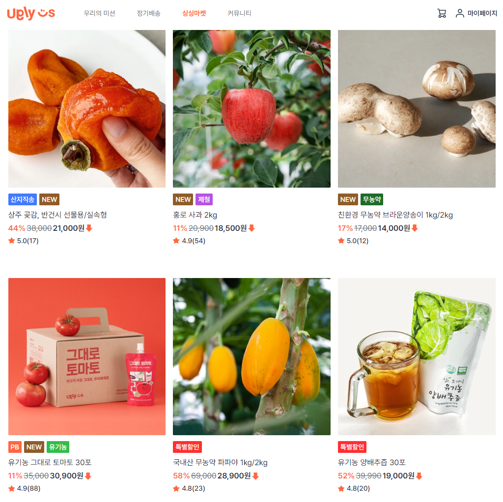 구독 서비스에서 받은 채소들을 따로 더 구매하고 싶거나 구독을 하지 않으면 받을 수 없다는 니즈를 충족할 수 있도록 싱싱마켓 서비스를 운영하고 있다. 아직 품목이 다양하지는 않지만 제철에 만날 수 있는 과일이나 채소를 원하는 수량만큼 구매할 수 있다.