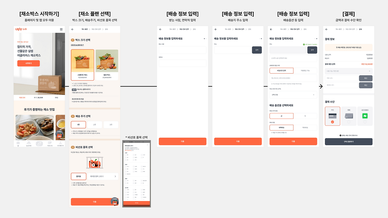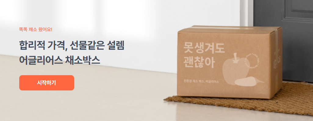 어글리어스 정기배송어글리어스 마켓에서 제공하는 주요 핵심 서비스는 브랜드 소개에서도 언급한 것처럼 채소박스, 정기배송 서비스다. 구독 신청은 앱, 웹에서 모두 가능하며, 신청 시 채소들이 담겨질 박스 크기부터 배송 주기, 비선호 품목을 선택할 수 있다. 비선호 채소 같은 경우는 해당 주에 어떤 채소들이 배송되는지 미리 되므로 이미 집에 있거나 선호하지 않는 제품이 있다면 미리 제외할 수 있다. 또한 담겨진 채소들이 어디에서 구출되었고, 이를 활용하는 레시피 페이퍼도 함께 제공된다.
