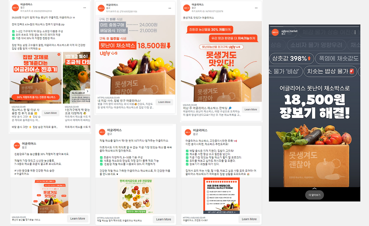 어글리어스 소셜미디어 광고메타 광고에서는 구독 서비스인 채소박스에 포커스하여 광고하는 것 같다. 못난이농산물 구출 키워드와 저렴한 가격, 많은 사람들의 후기들을 자주 보여주고 있다. 일관된 키워드를 자주 노출하고 주요 서비스를 계속 비춰주는 점에서 '어글리어스 = 못난이 농산물 정기배송'이라는 위치를 사람들의 머릿 속에 각인시키고 있다.