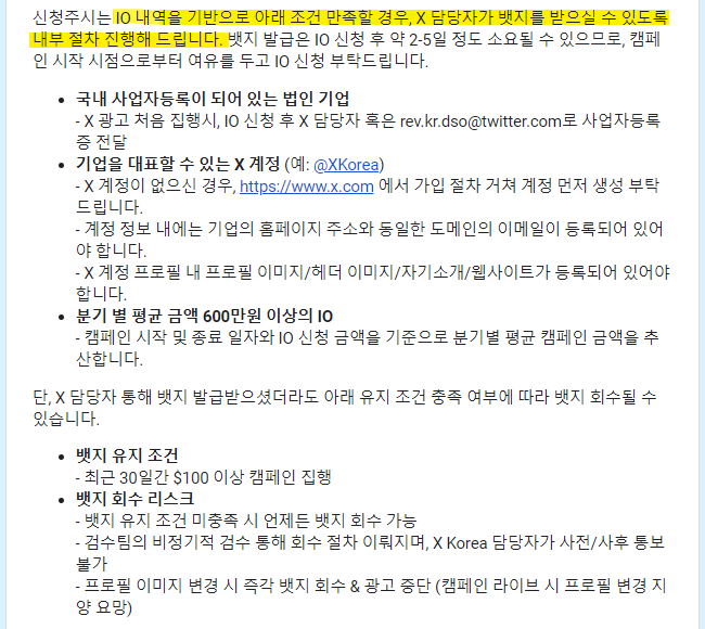 X 광고 진행을 위해 IO 신청 양식을 작성하고 캠페인 계획 등을 양식에 공유하면, X 코리아 담당자가 블루뱃지를 무료로 발급해줄 수 있다. 이 블루뱃지를 얻은 광고주는 X Premium 구독한 계정과 동일한 기능을 모두 사용할 수 있게 된다.