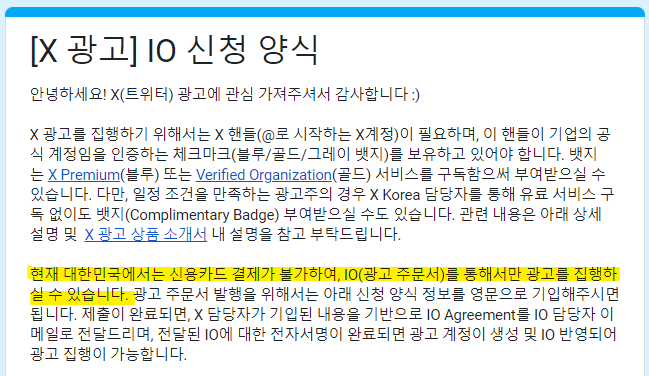 요약하자면, X 광고 진행 시 블루뱃지 등 보유해야 하고 IO로 광고 신청을 하면 된다!