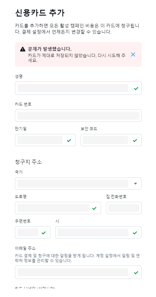 회사 도메인으로 이메일 가입을 한 뒤 바로 광고 진행을 위해 카드 등록을 시도했다.