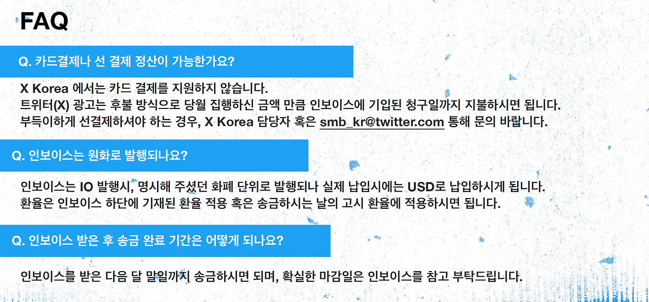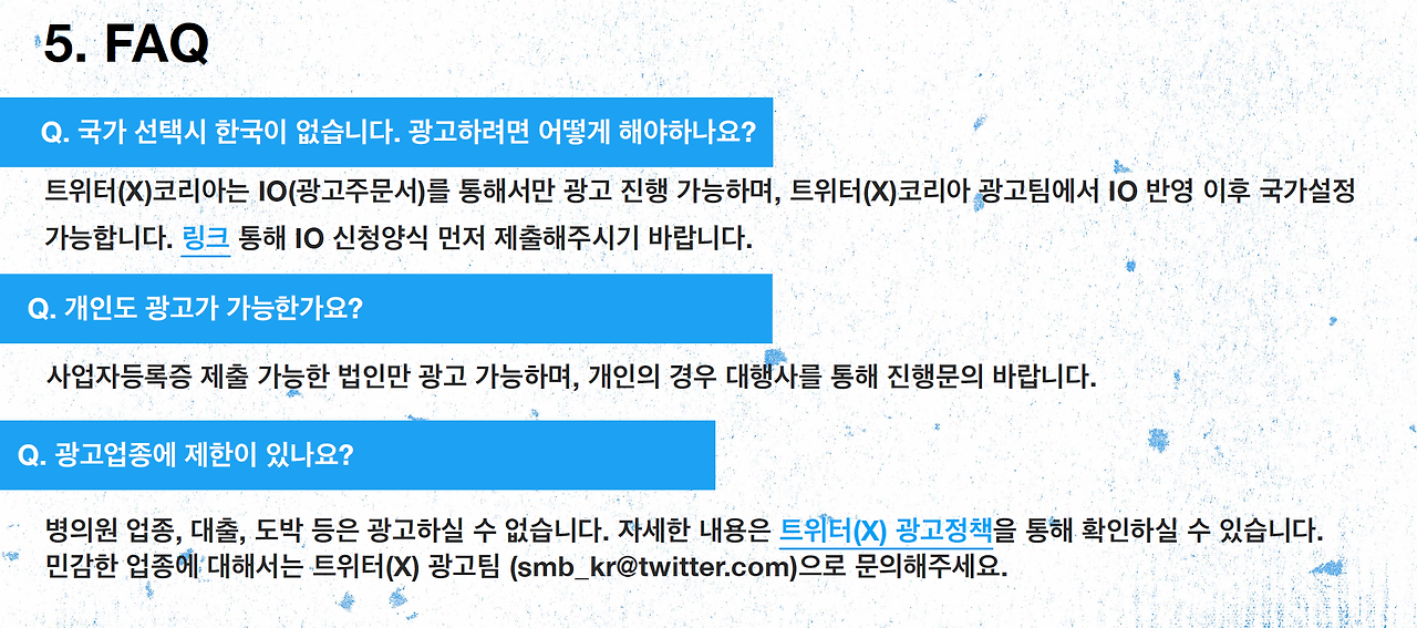 아래 참고한 링크나 파일을 모아뒀는데, 그 중 X 광고 FAQ (2023 Q4) 해당 파일에 간단한 FAQ를 확인할 수 있다. 만약 여기 없는 질문들은 고객센터로 문의하면 끝!