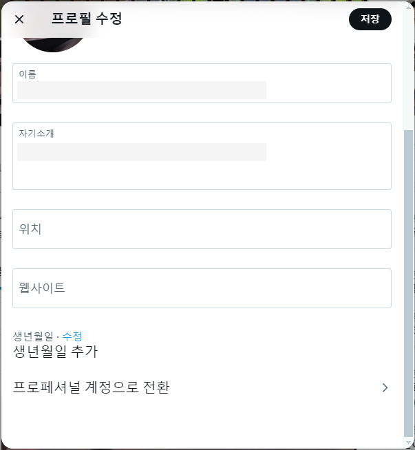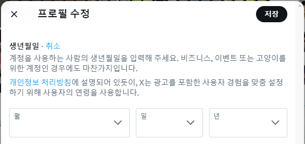 X 프로필 수정 - 생년월일나는 회사 계정으로 트위터 계정을 만들고 생년월일을 회사 창립기념일에 맞춰서 하겠다고 건들였다가 만 13세 미만에 걸려 계정이 잠겼었다. 하하 계정이 잠긴 경우에는 생년월일 재설정을 위해서 본인 이름 등 정보를 입력하고 본인 확인용 신분증을 제출하면 된다. 이런 실수를 안 하기 위해서 생년월일은 무조건 성인 기준으로 입력할 것! (당연)
