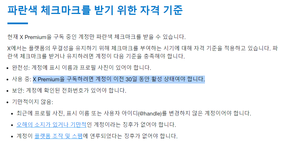 블루뱃지 자격 기준조금 더 찾아보니, X Premium을 구독 중인 계정만 블루뱃지를 받을 수 있는데, 이 X Premium을 구독하려면 계정이 30일 동안 활성화되어야 한다는 기준도 있었다. X 계정을 만들고 바로 X Premium을 구독할 수 없는 것 같다.