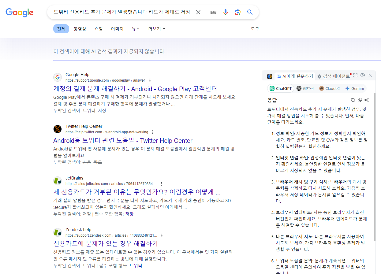 신용카드 추가 문제 구글링생각할 수 있는 경우의 수를 모두 다 수정해보고 입력했지만, 카드 등록은 계속 실패했고 실패 원인을 찾기 위해 구글링했지만 비슷한 사례 내용이 없었다. 보통 경고 문구들을 구글링하면 비슷한 사례가 나오거나 할텐데, 하나도 없었다. 아무도 나와 같은 문제를 겪은 사람이 없는 걸까?