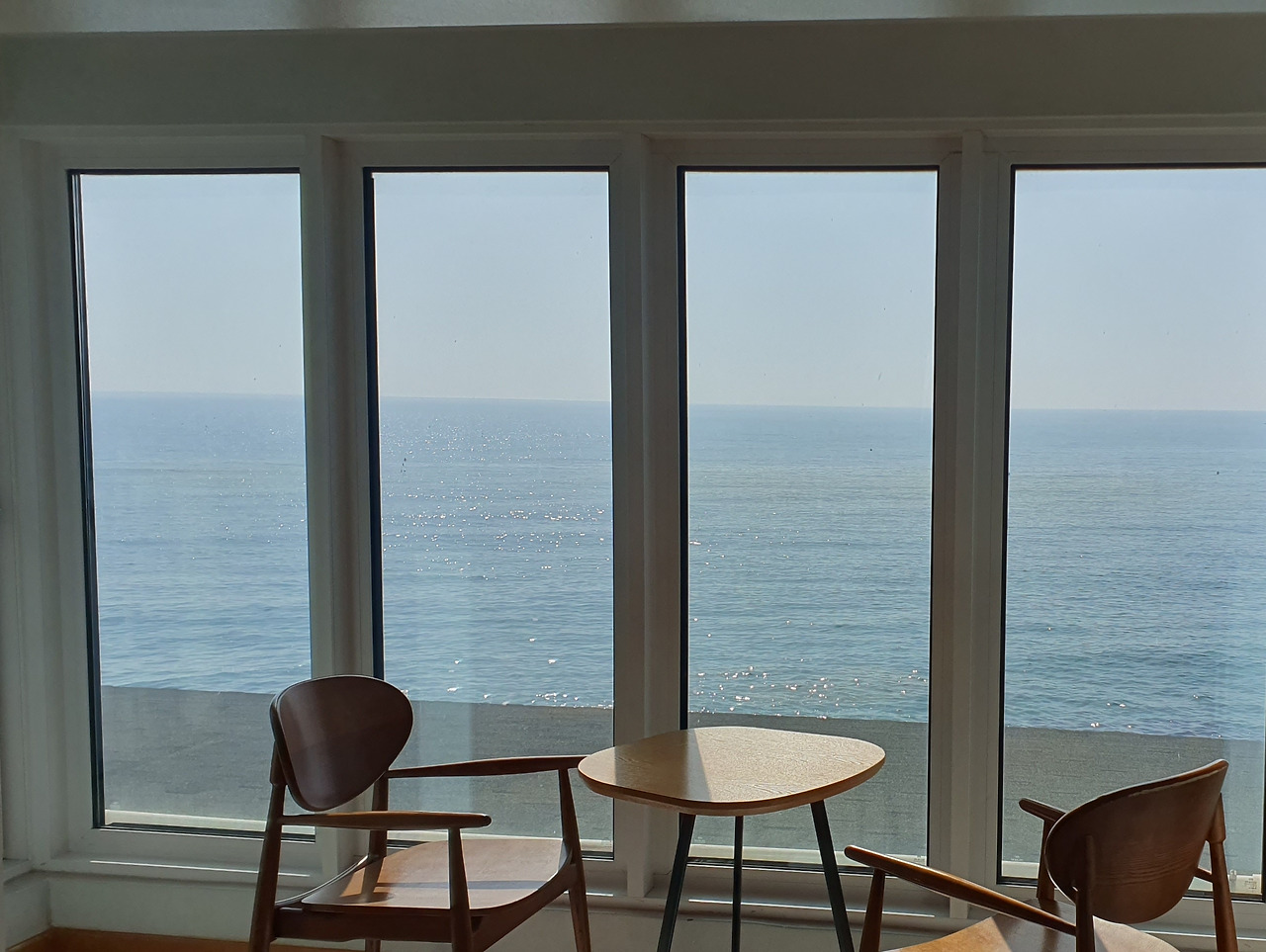 체크인을 하기 위해 숙소로 왔다. 바다가 보고 싶어 바다 바로 옆에 있는 숙소를 예약했는데, 방 문을 여는 순간 찰랑이며 드넓은 하늘빛 푸른 바다가 나를 반겨줬다. 가만히 보고 있자니 왠지 모르게 마음이 차분해졌다. 음. 정말로 휴식이 필요했었던 것 같다.