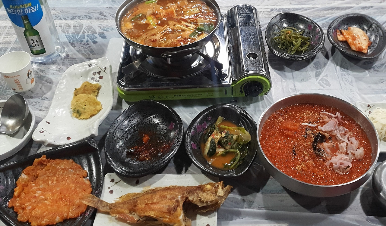 물회를 주문하니 아주머니가 말을 걸어오셨는데, 그 말에서 조심스러우면서도 따뜻한 관심으로 느껴졌다. 아주머니는 골고루 많이 먹으라면서 김치전, 낙지, 생선구이 등 밑반찬을 엄청나게 주셨다. 물회 하나 시켰는데 매운탕까지 끓여주셨다. 다 못 먹는다고 몇 개는 돌려드리려 했는데 손님상에 한 번 나온 건 다시 안 받는다면서 골고루 천천히 먹으라고 하셨다.