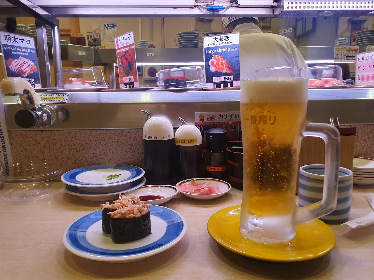 오늘의 목적지였던 오하라 여행을 마치고 숙소 근처로 돌아와 저녁을 위해 회전초밥집을 왔다. 오하라를 가는 과정에서 마음고생한 것이 있어 즐기고 싶은 만큼 즐기자 싶었다. 기린 생맥주와 초밥을 양껏 즐기고 나와 오늘 하루를 돌아보며 숙소까지 산책을 했다.