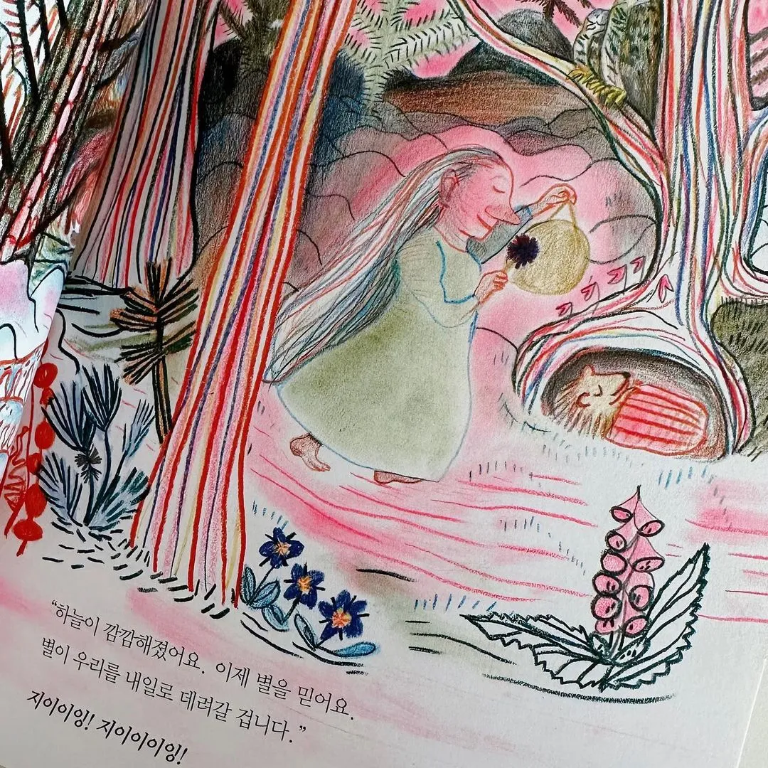 노란 징을 들고 다니며 숲속 동물들에게 이제 잠자리에 들 시간이라고 알려주는 밤 할머니. 내일로 우리를 데려다줄 ‘별’을 찾을 시간이라고 말하는 밤 할머니. 밤의 할 일을 다 마친 밤 할머니는 매일 밤 자신의 침대에 누워 이렇게 묻는다. “내겐 누가 잠자리에 들 시간을 말해줄까요?” 그러고는 곧바로 웃으며 오로지 자신만을 위한 징을 울린다. 자신을 내일로 데려다줄 별을 찾은 뒤 금세 잠이 든 밤 할머니의 얼굴은 안온하기 그지없다. 그 얼굴 위에 나의 얼굴을 포개어보았다. 쉬이 잠들 것 같지 않아도 매일 정해놓은 시간에 침대에 몸을 뉘었던 나의 얼굴. 피곤하고 지친 하루였어도 다시 돌아보고 자주 돌아봐서 기어코 내가 원하는 모양과 형태로 ‘오늘’을 다듬고 닫으려 애썼던 나의 얼굴. 오늘의 좋았던 기억은 내일로 나를 데려다주는 동시에, 내일의 나를 빛나게 해줄 나의 ‘별’이었음을. 나도 모르게 나는 이미 이를 알아내고 살아내고 있었던 걸까. 그래서 긴장과 불안에 아득히 잠식되지 않을 수 있었던 걸까. 생각의 꼬리를 늘리고 이어가고 있던 그때. 어느새 내 옆에 밤 할머니가 찾아와 앉아있었다.