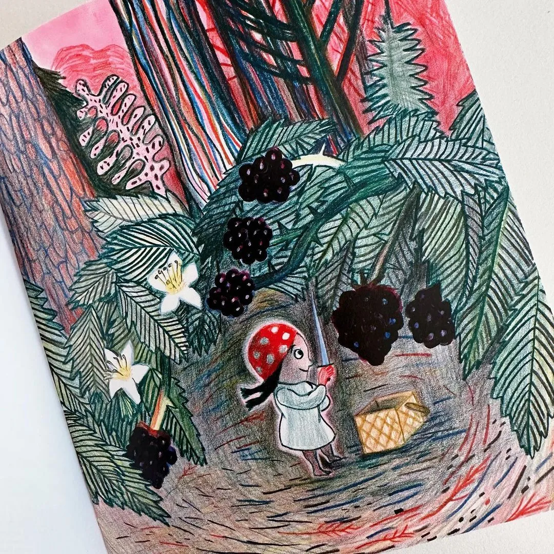 베리를 따는 커다란 축제가 열린 어느 마을. 아주 빨갛거나 파란 베리를 찾는 다른 사람들과는 달리, 소라는 자신이 진정 원하는 블랙베리를 찾기 위해 숲속 여기저기를 돌아다닌다. 그러다 집으로 돌아가는 길을 잃어버리게 된 소라. 소라는 블랙베리를 딸 수 있게 돕는 도구이자 자신을 보호하는 도구인 ‘칼’을 손에 꽉 쥐고서 용감하게 길을 헤맨다. 그러다 우연히 만난 누군가에게로부터 우연한 환대를 받게 되어 잃어버린 길 위 어딘가에서 그와 함께 잠들게 된 소라. 잠든 소라의 표정 또한 매우 편안해 보인다. 어쩌면 소라는 오늘의 길을 잃어버린 것이 아니라 집으로 돌아가는 길 하나를 더 찾은 거라 생각하면서 편히 잠든 것은 아닐는지. 그리고 나 또한 어쩌면, 잠으로 가는 길을 잃어버린 것이 아니라 내 몫의 잠을 되찾기 위한 새로운 길을 용감하게 걸어가고 있는 것은 아닐는지. 내가 원하는 것을 찾아가도록, 내가 원하는 나를 지킬 수 있도록 나를 돕는 나의 ‘납작하고 네모난 칼’들과 함께. 확인의 마음이 조금씩 확신의 마음으로 바뀌어 가고 있던 그때. 어느새 내 다른 쪽 옆에 소라가 찾아와 앉아있었다.