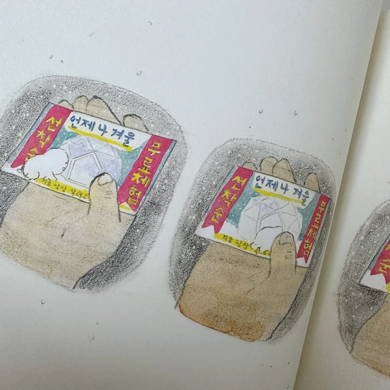 여자가 아이를 위해 ‘문 바깥’과 ‘문 안’의 경계를 넘어설 때마다, 종이의 질감도 따라 달라진다. 보고 만지고 읽는 이들이 '눈,물'을 감각할 수 있도록 돕는 물성에 어찌 감탄하지 않을 수 있을까. 계절을 달리해 다시 볼 때마다, 나는 여자와 함께 '눈물'을 흘린다. 까끌까끌한 결을 애달프게 어루만지며. 매끈한 결 위에서 간신히 버텨내며.
