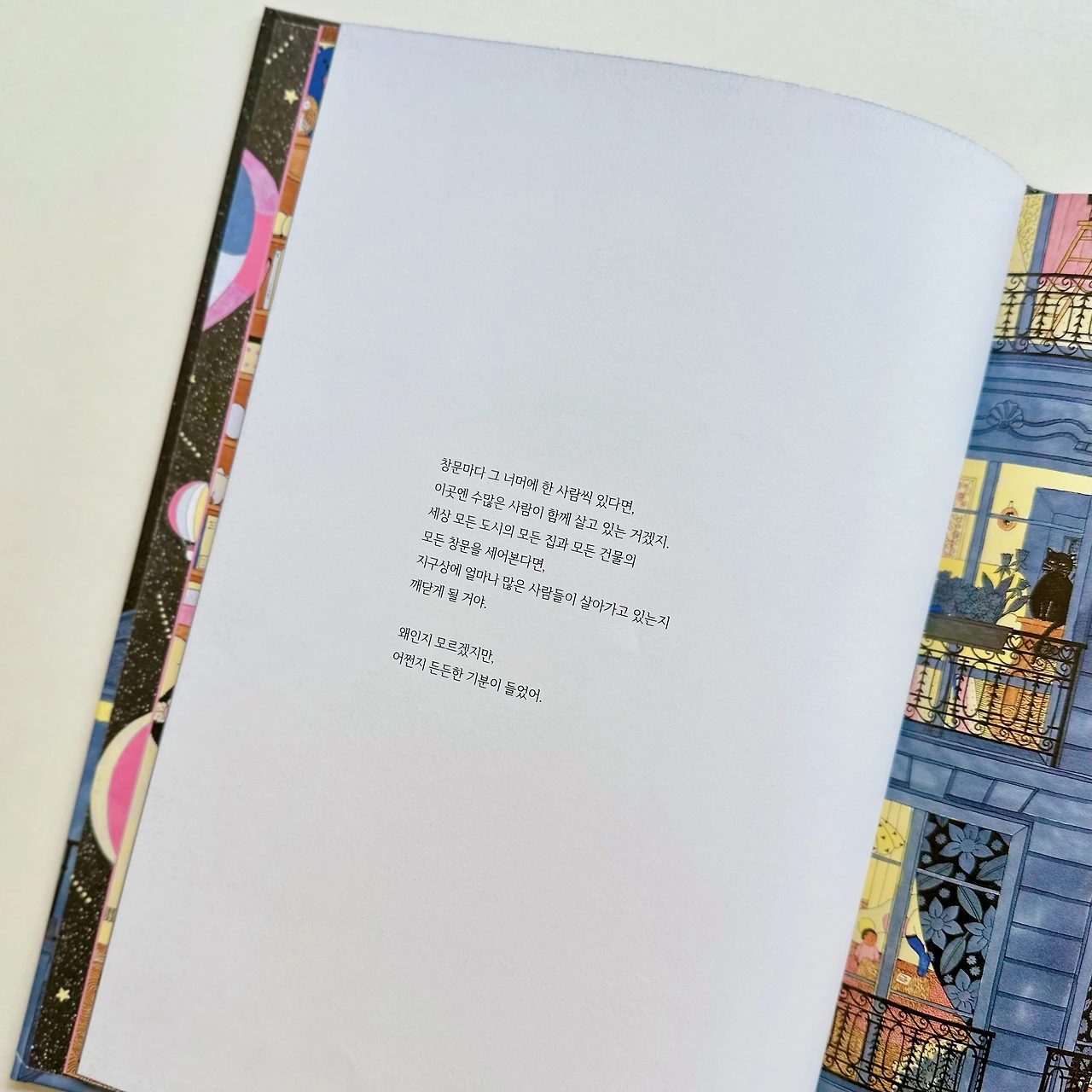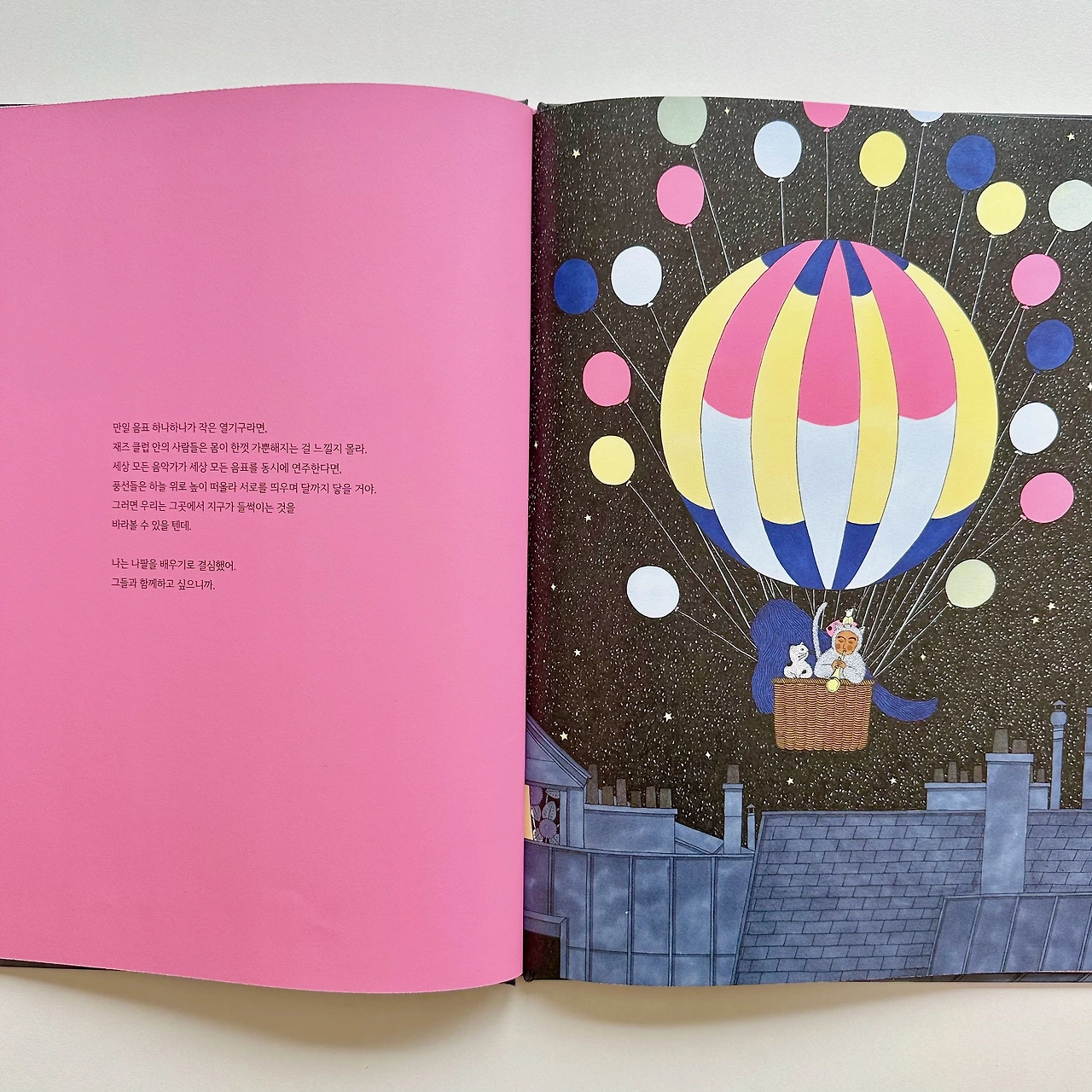 자는 사이에 찾아올 나의 꿈에서, 사는 사이에 찾아갈 너의 꿈에서, 결국은 ‘세상 모든’ 밤낮에 살아내고픈 우리의 꿈에서 두 손 맞잡아 함께 쥘 핑크색 풍선. 각자의 길을 잃지 않는 방법이, 서로가 서로를 해방시키는 마법이 펼쳐지는 꿈같은 그림책, ⟪세상 모든 밤에⟫. 큼직한 판형에 담긴 큼직한 아름다움이 ’세상 모든’ 아침을 경이롭게 깨울 것만 같다. 장마다 촘촘히 채워진 패턴의 수와 종류만큼 감탄하고 감동하는 것은, 이 아름다운 그림책이 독자에게 내어주는 큼직한 선물일 테고.