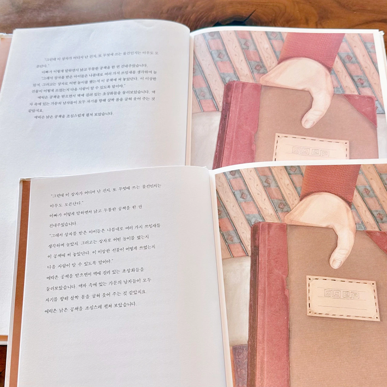 몇 세대를 거쳐 내려온 파란 선물과 함께 건네받은 낡은 공책에는 앞선 이들이 각자 어떻게 이 선물을 사용했는지를 적었던 기록들이 담겨있다. 공책을 펼쳐 지나간 시간 속의 지나간 쓰임새를 하나씩 확인하고 상상하며, 클라라와 에릭은 연신 감탄한다. 동시에 자연스레 알아차린다. 시간과 비밀이 겹겹이 쌓여온, 그리고 지금의 나에게로 전달된 이 ‘선물’의 쓰임새를 자신 또한 마음껏 결정할 수 있음을. 이 공책에 담긴 지나온 기록과 자신의 손으로 더할 지금의 기록 모두가 오래도록 사라지지 않을 귀한 생일 선물임을.