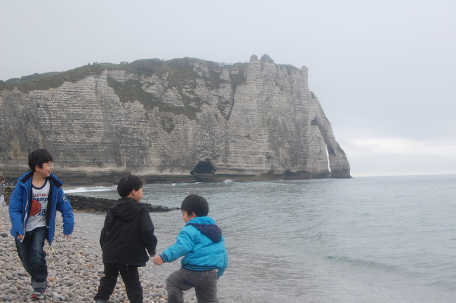 그리 노는 사이, 저 멀리 오른쪽으로 다몽 절벽(Porte d’Amont, 상류 문)의 아기 코끼리가 외떨어져 무심히 섰고, 가까이 다발 절벽 엄마 코끼리는 성난 바다가 무서운 줄도 모르고 성큼성큼 걸어 들어가고 있었다.