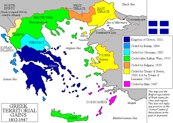 1830년 오스만제국으로부터 독립한 그리스는 지도의 짙은 파란색 부분에서 시작하여 조금씩 영토를 넓혀 나갔는데, 발칸전쟁에서 오스만에 승리한 그리스는 연두색 부분과 같이 이스탄불 지역을 제외한 마케도니아 남부지역과 에게해 섬들을 취했고 이때 현재의 그리스 국경 대부분이 확정되었다. 제1차 세계대전 (1914년부터 1918년까지) 후 오스만제국이 급격히 쇠퇴하자 오스만제국 본토로 진격해 들어가서는 지도의 노란색 부분인 아나톨리아(소아시아) 지역에까지 영토를 넓혔다.