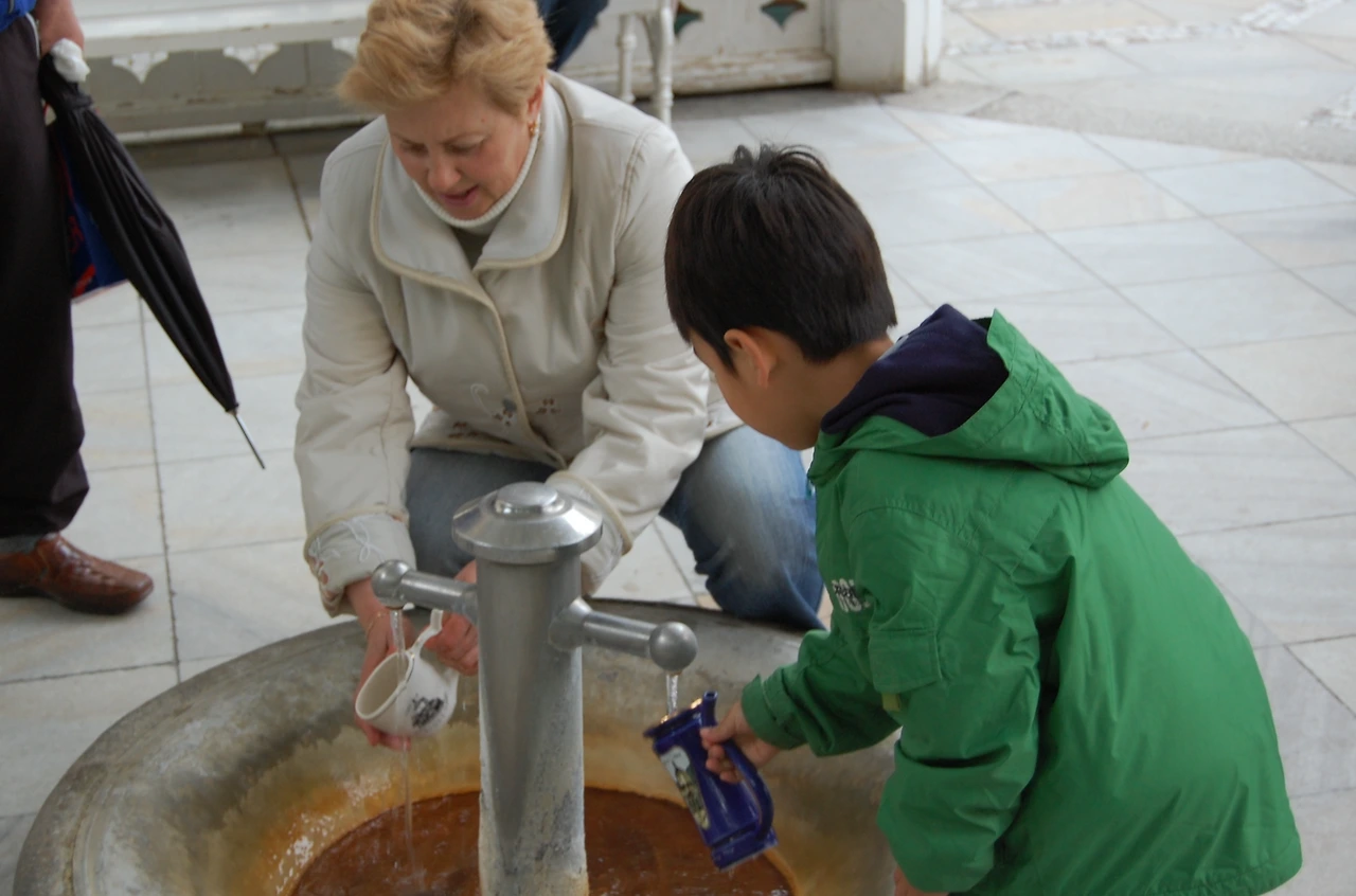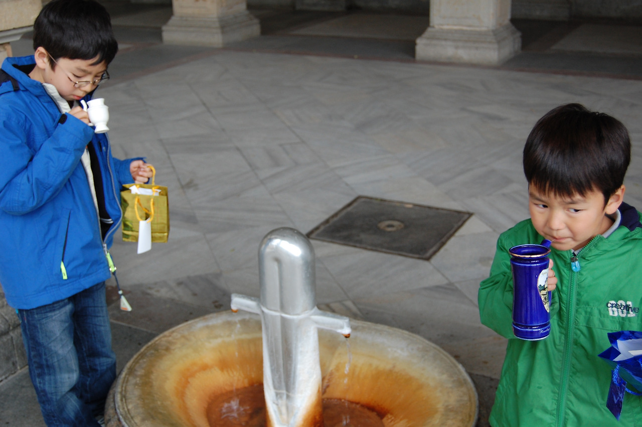 지붕 덮인 콜로나다 아래에선 치유의 온천수가 포셋(Faucet) 수도꼭지를 통해 토출 되었다.