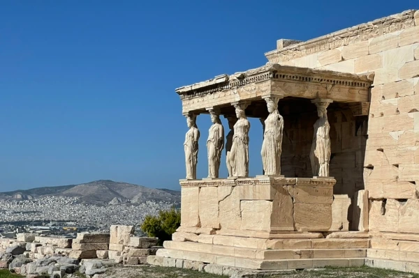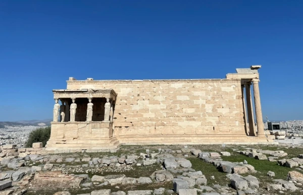 아크로폴리스에 들어서는 순간 처참히 파괴되었을지언정 파르테논 신전의 위용에 압도되어 사람들은 자연스럽게 시계 반대 방향으로 발길을 옮긴다. 그러다 보면, 오스만 총독의 후공 처소로 전락하는 치욕을 맛보았던 에레크테이온 신전과 조우한다.