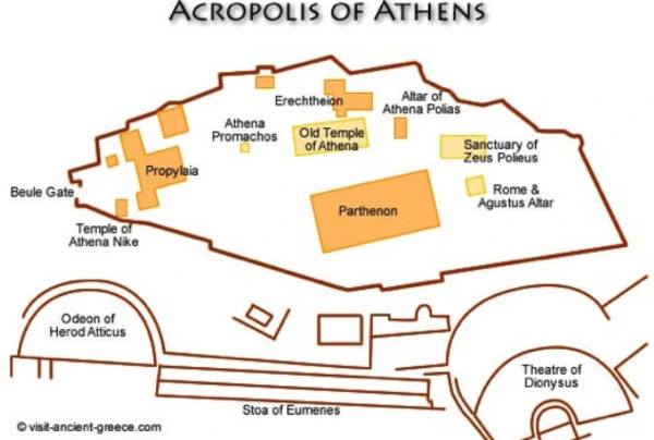 3. 아테네의 토대를 이루는 전설들이 생겨난 신성한 곳이다. 바로 그곳에서 아테나와 포세이돈이 아테네를 차지하기 위해 아테네 최초의 왕인 케크롭스 면전에서 싸웠다. 포세이돈은 소금물이 나오는 샘을 만들었고, 아테나는 올리브나무를 내놓았다. 그 나무는 기원전 480년에 페르시아인들이 잘라냈으나 이듬해에 다시 자라났다. 아테나가 헤파이스토스와 관계를 가져 에리크토니오스 왕이 이곳에서 태어났으며, 아들 테세우스가 미노타우로스에게 잡아먹혔다고 생각한 아이게우스가 바다에 뛰어든 곳이기도 하다. 그 바다는 그의 이름에서 유래하여 ‘에게해’라 불린다.