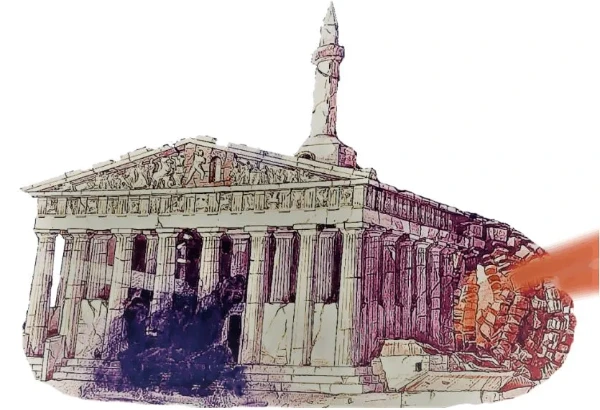 급기야 인류 역사상 경악스러운 사태가 발생하였으니, 1684년에서 1699년까지 베네치아가 아테네를 점령하려고 침략했을 당시 오스만제국은 아크로폴리스를 전투 요새화하면서 파르테논 신전을 화약고로 사용하였는데, 1687년 베네치아 군대가 필로파포스 언덕에서 아크로폴리스를 향해 발포한 박격포 포탄이 파르테논 신전 안으로 떨어지면서 보관 중이던 화약이 일제히 폭발하였다. 오호, 통재라! 위대한 신전은 그렇게 일순간에 처참히 파괴되고 말았다.