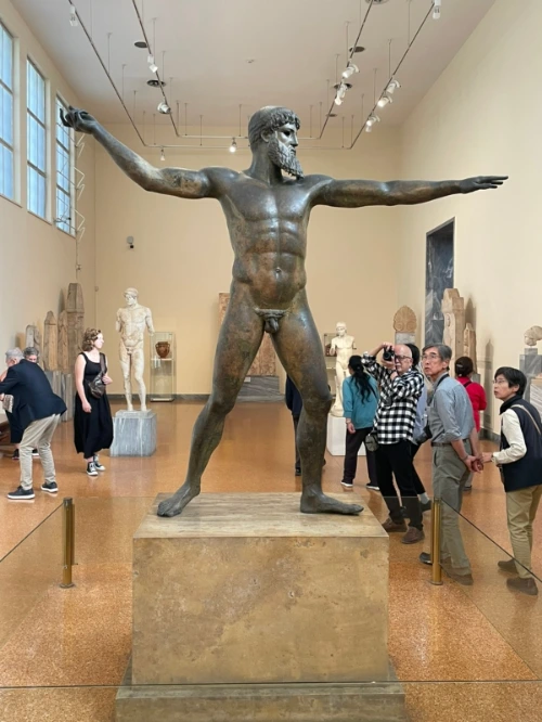 파르테논 신전이 건립되기 전에 만들어졌을 이 청동상은 1928년 어부들이 바다에서 발견했고 어딘가를 표적 하는 왼팔은 그보다 앞서서 같은 바닷가에서 따로 발견되었다고 하는데, 삼지창을 든 포세이돈이라고 쭉 믿어지다가 요즈음은 번개를 든 제우스로 더 많이 불려진다고 한다. 번개든 삼지창이든 막 던지려는 순간의 인체 표현이 (특히 왼발 끝을 힘주어 살짝 들어 올린 부분) 기원전 5세기에 만들어졌다고 믿기 어려울 정도로 사실에 가까워 미술사에 있어 예술혁명으로까지 평가받는다고 한다. 이 작품 이전까지의 인체상들은 상당히 유치한 수준이었다고 한다. 아테네의 황금시대에는 예술도 찬란하게 꽃을 피웠나 보다.