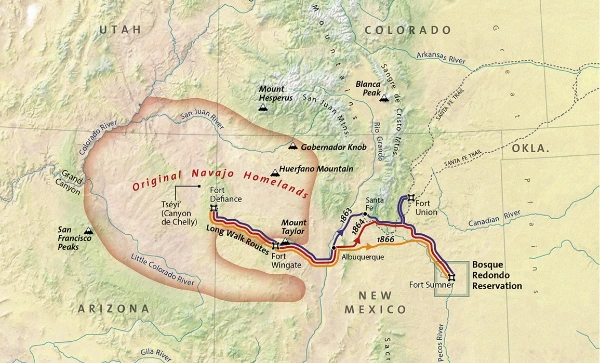 나바호족이 살던 땅이 1848년 미국 영토로 편입될 당시 콜로라도에서 금맥이 터지자 사람들은 나바호 땅에도 엄청난 금이 매장되어 있을 거라고 믿었다. 1864년, 미국 정부는 삶의 터전을 지키기 위해 결사항전하는 나바호족을 제압한 후 600km가량이나 떨어진 뉴멕시코 지역의 수용소로 쫓아냈다. 그리고는 농사를 짓게 하고 기독교로 교화시키고자 했다.