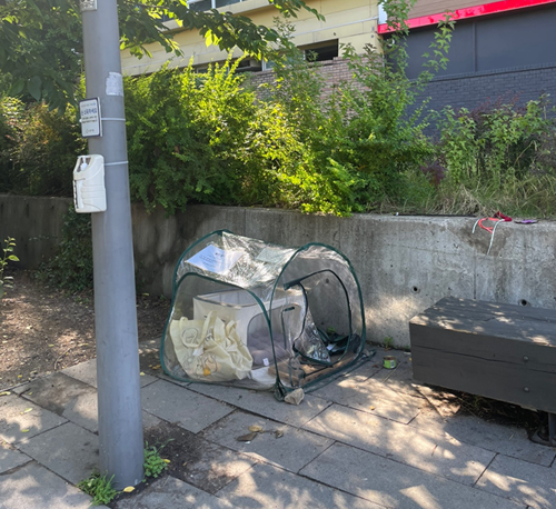 주말이면 다니는 산책길에 낯선 풍경이 보였다. 처음에는 누가 쓰레기를 방치했나 했는데 가까이 가보니 소형 투명 텐트였다. 미관상 보기 좋지 않은 데다 바로 옆이 사람들이 쉴 수 있는 벤치가 있는 곳이라 더욱 눈살을 찌푸리게 됐다. 그런데 텐트에 쓰여있는 문구를 읽으니 복잡한 마음이 든다.