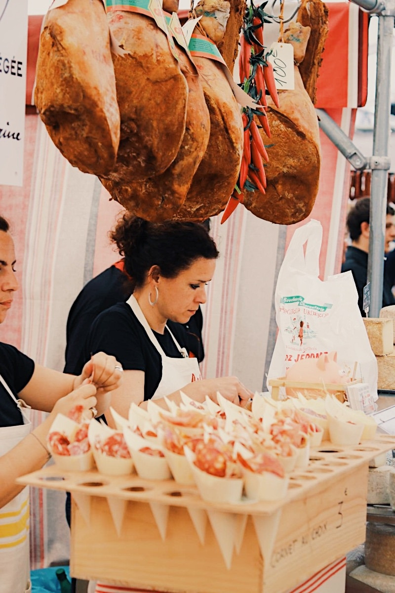 콘 형태의 종이에 다양한 햄류를 담아 3유로에 판매 중이었던 부스. 물론 비닐 포장된 제품 또는 통다리 형태의 잠봉 역시 판매하며, 운이 좋다면 종류별로 시식 후 구매할 수도 있다.