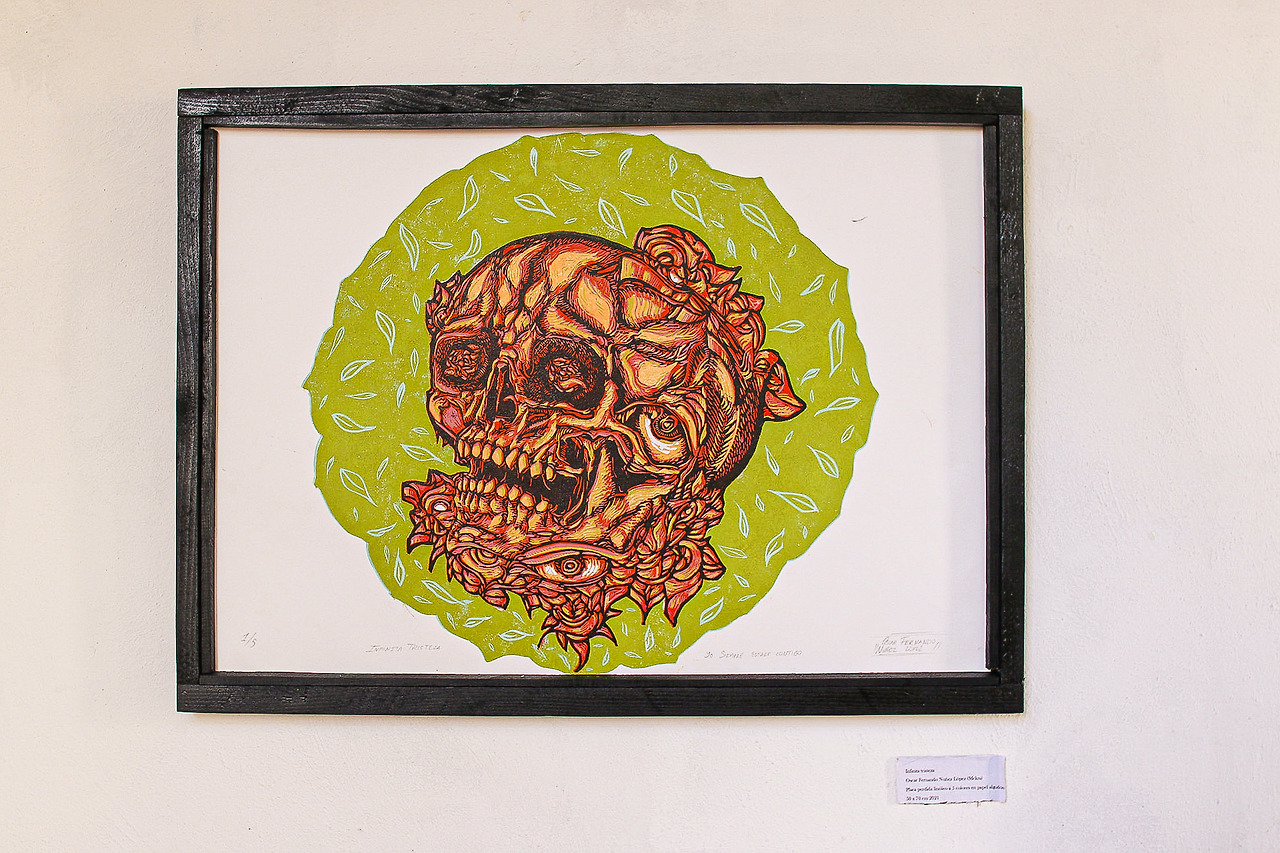 전시 공간들을 잇는 복도에서는 죽음을 다양한 모습으로 담아낸 작품들이 전시되어 있었다. 위의 이미지에서 짐작할 수 있듯, 멕시코에서는 해골이 불길하거나 음산한 존재로 그려지지 않는다. 두개골 장식은 이와 같은 의미를 가진다.