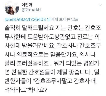 의학적인 지식 차원으로 봤을 때 나는 의사들이 나의 그것과는 비교도 안되게 공부 양이 우월하다는 것을 안다. 성공을 위해 혹은 환자를 위해 의대에 헌신하고 병원에 헌신하기로 한 그분들을 존중한다. 하지만 시대가 많이 변했다. 더이상 우리나라의 간호사는 옛날의 의사의 진료업무를 그냥 '보조'하던 위치가 아니다. 환자가 '아가씨 이것 좀 가져다 줘, 저것 좀 가져다 줘, 리모콘 좀 가져다 주시오' 하는 식으로 가볍게 대할 위치의 직업군으로써는 더이상 볼 수가 없다는 거다. 우리는 환자의 곁에 24시간 있다. 말 그대로 24시간이다. 간병인처럼 있는 24시간을 의미하는 게 아니다. 의학적인 지식을 가지고 곁에 있다. 환자에게 무언가 나타나는 낌새를 감지해내고 의사가 이 사람의 전반적인 바이탈이 어땠으면 좋겠다 말하면 그것을 이뤄내기 위해 함께 애쓴다. 우리는 약을 준다. 운동을 시키고 숨쉬게 하고 위생간호를 제공한다. 우리의 24시간이 그렇다. 우리의 활동은 늘 환자를 기반으로 한다. 의학적인 지식을 가지고.