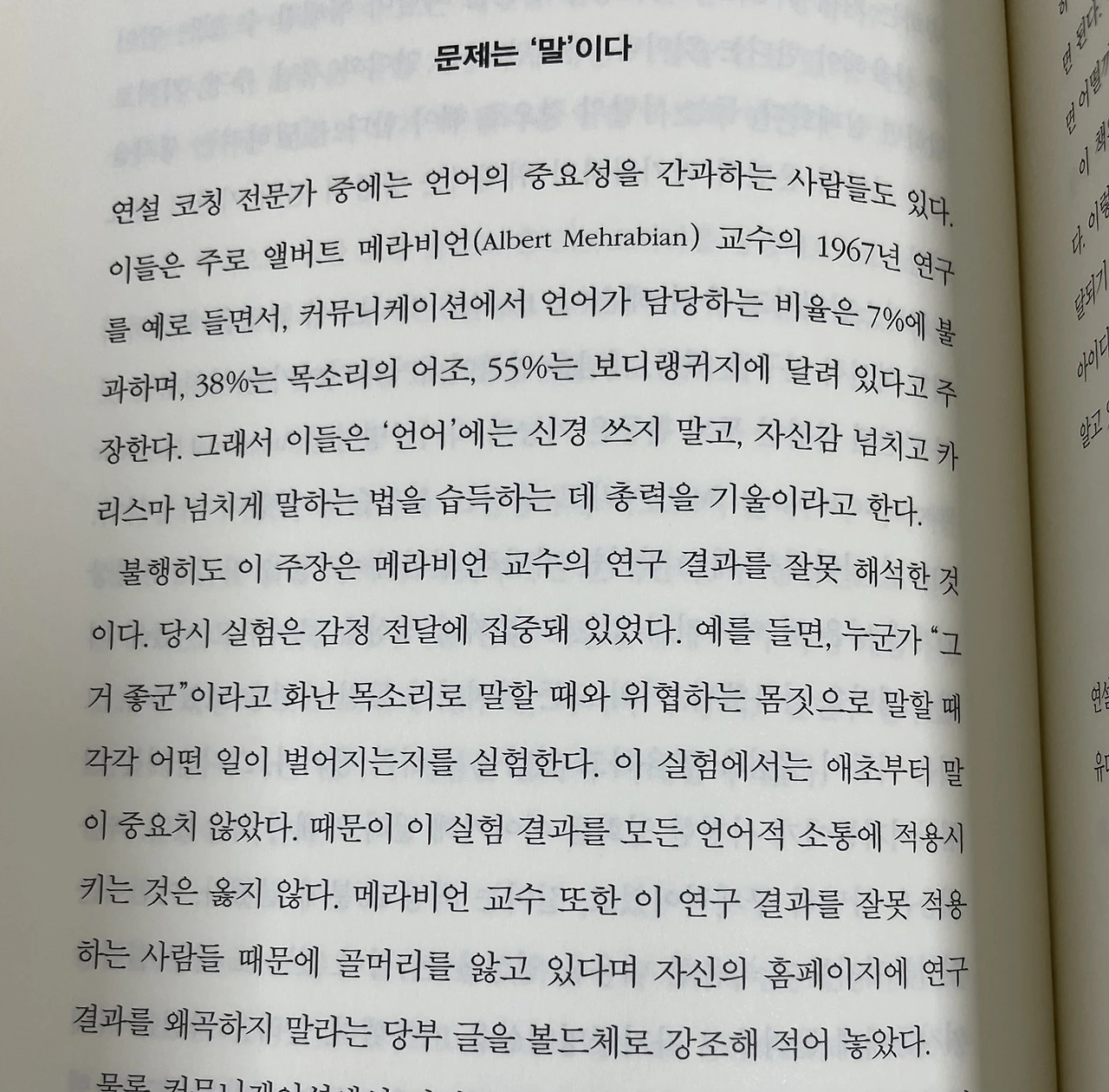 왜 메라비안의 법칙을 무조건 믿으면 안 되는 걸까? 왜 메라비안의 법칙이 잘못 사용되고 있을까? 나는 그 이유를 이렇게 생각한다.