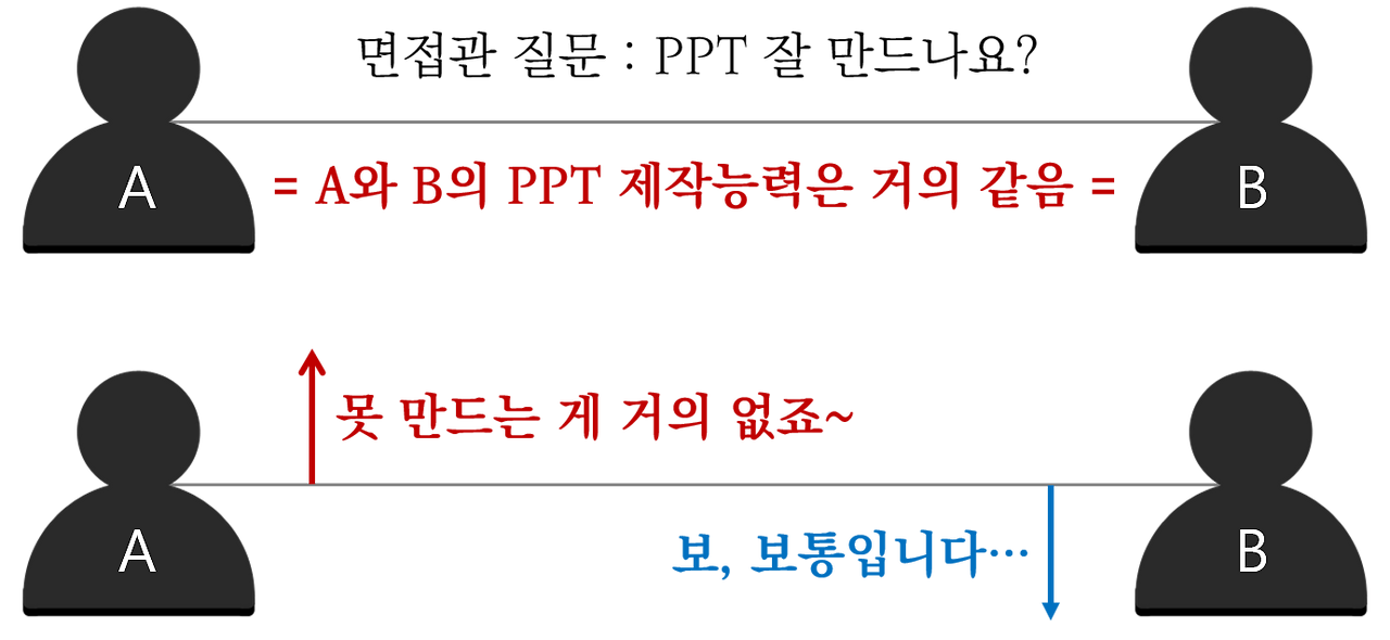 A와 B 두 사람이 면접을 보고 있다. A는 자신에 대한 과대평가에 능하다. B는 겸손 아닌 겸손이 입에 배어있다. 면접관이 묻는다. 'PPT는 잘 만드나요?' 두 사람의 PPT 제작능력은 거의 동일하다. 한데 두 사람의 답이 전혀 다르다.