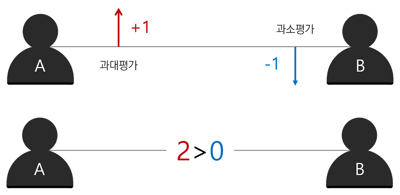 두 사람의 답을 들은 면접관은 어떻게 생각할까? 점수로 따져보자. A와 B의 PPT제작 실력은 거의 동일했다. A=B 상태에서 면접을 시작했다. 저 질문을 받기 전에는. 하지만 각각의 대답에서 A는 +1이 되었고, B는 -1이 되었다. 둘 다 0에서 시작했지만. 적어도 PPT 제작 실력에서만큼은 A가 2이고 B가 0이다. B가 스스로를 깎아주었기 때문에 1점이 아니라 2점 차가 되었다.