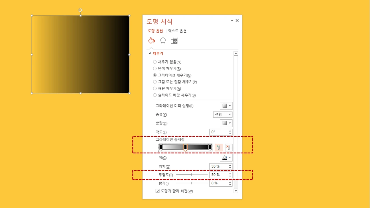 - 도형을 선택한 후 '도형 서식' 선택, 채우기에서 '그라데이션'을 선택한다.