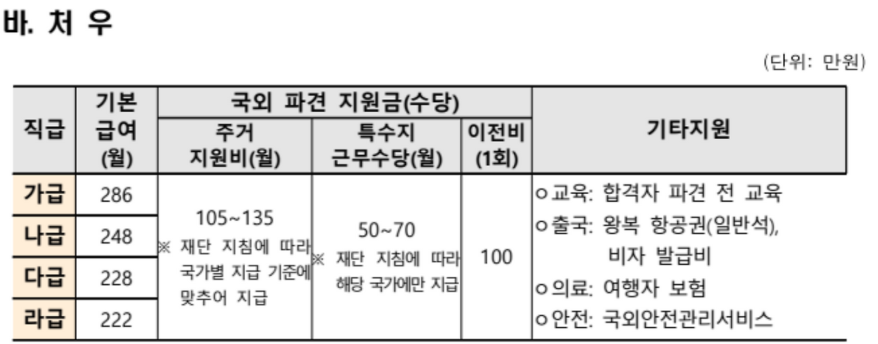 대부분 실비처리가 되므로 본인이 먼저 발급비를 부담해야 됩니다. 즉, 재단에게 돈을 미리 받아서 결제할 수도 없고, 발급 비용 발생 시 당장 대신 결제를 해주지 않는다는 것입니다. 급여와 지원금은 근무를 하는 동시에 미리 지급되지 않는 점을 반드시 주의하셔야 합니다. 생각보다 출국 이후에 당장 본인이 부담해야 될 금액이 상당히 큽니다. 나중에 지원을 받게 되더라도 당장 지급을 해야 될 돈이 없으면 매우 곤란합니다. 재단이 이 부분까지 해결해 주지는 않습니다. 그래서 해외 출국 전에 미리 저축을 해 두셔야 합니다. 물가 수준이 높은 국가를 선택하신 경우라면 재정적으로 더 힘드실 수도 있습니다. 집을 구하는 것부터 당장의 계약금 지급이 어려워 곤란해질 수도 있습니다.