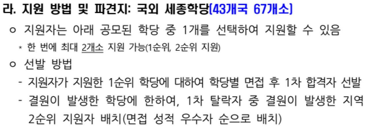 제가 앞서 '준비하기' 편에서도 말씀드렸지만, 파견지를 결정하시기 전에는 '파견 국가'에 대한 이해와 근무하게 될 '학당'에 대한 이해가 선행되어야 합니다. 결정 방식은 쉬워도 충분한 이해를 바탕으로 신중하게 결정하시기 바랍니다.