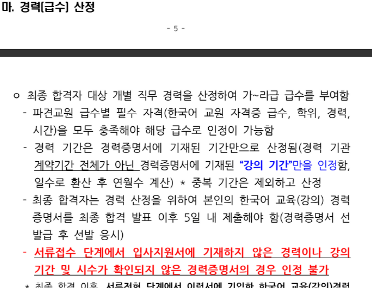 공고일 기준으로 서류 접수했을 때 제출한 경력만 인정되고 최종합격 후 새로 생긴 경력은 인정되지 않습니다.