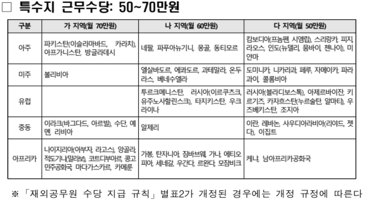 월 기본 급여가 적은 편이긴 하지만, 주거 지원비가 추가되는 이점이 있습니다. 물론 국가별 지급 기준에 따라 차등 지급하지만 최소 105만 원은 확보가 됩니다. 특수지 근무수당의 경우에는 모두가 받을 수 있는 수당이 아니므로 반드시 국가를 확인해야 합니다. 특수지 근무수당을 받는 국가는 한국인들이 살기에 상대적으로 열악한 환경일 수 있는 국가들로 한정됩니다. 모든 파견교원들이 받는 수당은 아니므로 반드시 미리 확인하셔야 합니다.