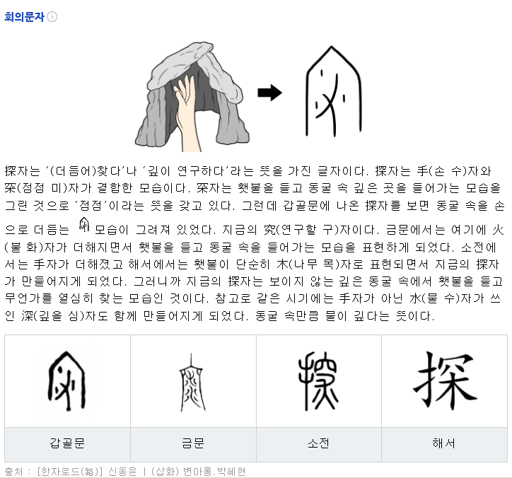 찾을 (탐). 왼편에 손 (수)와, 오른편에 점점 (미)가 합쳐진 이 글자는 한 손에 횃불을 들고 캄캄한 동굴 속을 더듬어가며 점점 그 안으로 들어가고 있는, 그러니까 ‘어떤 사람’이었다. 그가 어둠의 공포에 맞서며 그토록 열심히, 필사적으로 찾았던 것은 무엇이었을까. 자신의 외투에서 어느 공장의 소녀를 떠올리던 루시드폴의 노래가 생각나는 잠깐의 전율이었다. 오래도록 살아남아 어느 날 내게로 온 이 글자는 활자 너머에 사람이 있었다. 때로 참 부질없게 느껴지는 나의 사색이, 글을 쓴다는 것이 먼 옛날을 살던 누군가의 절박한 찾음의 행위와 일면 닿아 있음에 마음껏 뭉클해졌다. 너만 그런 게 아니라고. 잘 보이지 않아도 포기하지 말고 앞으로 조금씩 나아가는 것, 그게 우리가 살아왔고 살아가는 하나의 방식이라고. 그 아름다운 갑골문이 어느새 지쳐버린 나를 다독여 주는 것 같았다.