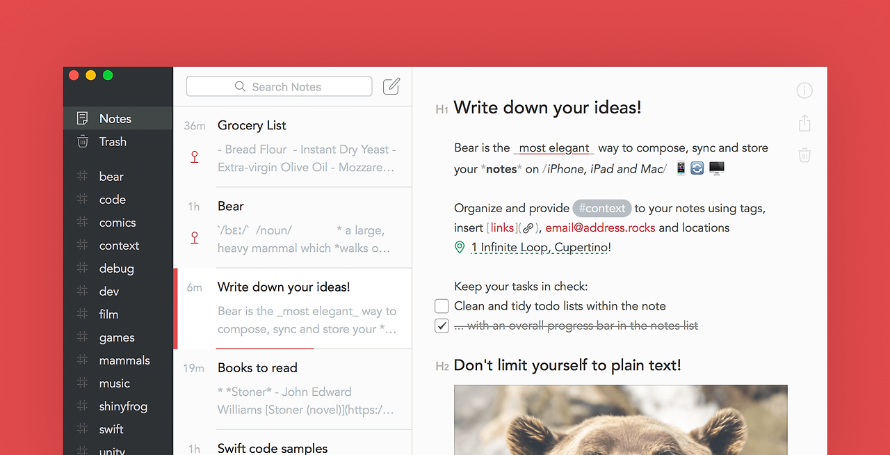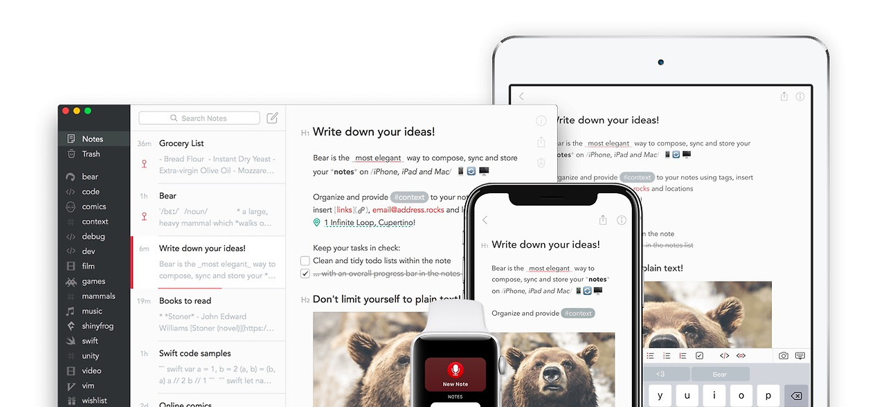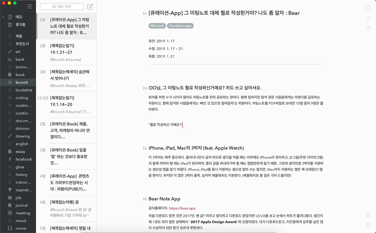 이에 비해 Bear의 가장 큰 장점은 딱 필요한 포맷들을 ‘아름답게’ 보여준다는 점. 볼드, 이탤릭, 언더라인, 불릿, 숫자, 인용구, 코드삽입 정도의 간단한 양식들을 수려하게 제공한다. 삽입된 사진도 바로 볼 수 있다. 마이너 업데이트를 통해 애플펜슬로 글쓰기까지 가능하다. 체크리스트 기능도 제공한다.