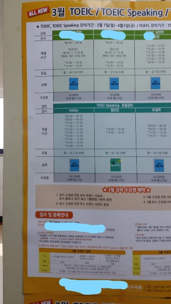 입학식 전후로 교내 곳곳에 뿌려진 전단을 통해 학교에서 하는 'ESP'라는 영어 프로그램이 있다는 것을 알게 되었다. 취업을 위해 어학 성적이 필수라는 이야기는 익히 들었던지라 관심이 생겨 홍보물을 유심히 살펴봤다. 일정 출석률과 TOEIC 성적을 넘기면 강의료를 환급해 주고, 하루에 한 번, 공강 아무 때나 들으면 되는 방식이라 시간에 대한 부담도 없다고 소개했다. 6개월이나 수업을 하는데도 시중 학원의 한 달 가격도 하지 않을뿐더러, 교재와 모의토익 응시 기회도 준다고 해서 홀린 듯이 신청을 하게 되었다. 마침 같은 과 동기도 이 수업을 듣는다고 해서 같이 다니기로 했다. 이렇게나 광고가 무섭다. 한 과에서 두 명이나 낚다니.