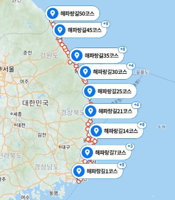 들어본 적은 있었다. 부산에서 시작하여 저 멀리 강원도 고성 통일전망대까지. 동해 바다를 끼고 걷는 길을 만들었다고. 네이버 지도에서 검색하면 대충 아래 사진과 같은 경로가 나온다.