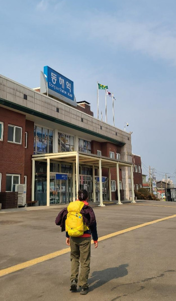 그리고 도착한 33코스의 마지막 지점 묵호역 인근. 역이 해파랑길에 포함되어 있지는 않아서 우리는 일부러 조금 더 걸어서 묵호역까지 갔다. 화장실도 쓰고 사진도 찍고. 걷다 보면 가장 소중한 게 화장실이다. 여름이면 더워서 땀 배출이 많이 돼 그렇게 요의가 자주 느껴지진 않는데, 겨울에는 땀이 많이 안 나다 보니 생각보다 화장실을 자주 가게 된다. 그렇다고 몸을 쓰는데 물을 안 마실 수도 없으니 화장실을 발견하면 무조건 가고 봐야 한다. 까미노를 걸을 땐 노상방뇨도 좀 했었는데^_^ 한국에선 쉽지 않은 일이다^_^ 화장실을 찾아야 한다^_^